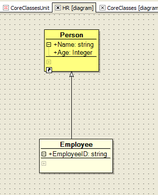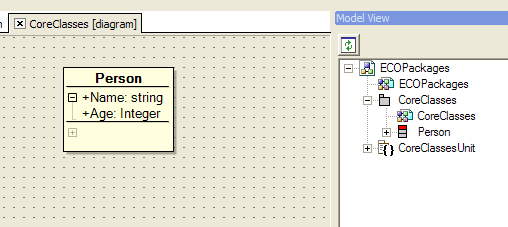 First, I create a new ECO WinForms app, go to the Model View and bring up the CoreClasses diagram. I’ll create a simple Person class, like so: