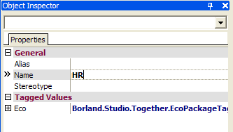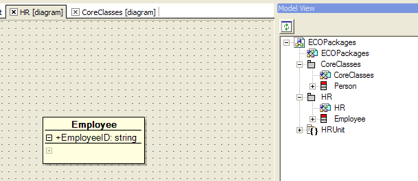 Next, I want to define another class in a seperate package, so I’ll first create a new package. You can go the File | New route, but I find it easier to right-click on the ECO Packages node in the Model View and select Add | ECO Package. This will result in a Package_1 package node being added to the Model View, but lets rename it and save it somewhere sensible. Select the grey Package_1 node and in the Object Inspector set the name property to HR.