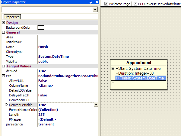 How? Well, select the Finish attribute in your model, and in the object inspector, set the DerivedSettable property to True. If you now look at the sourcecode for the Finish declaration, a setter method (called set_Finish) has been added. We’ll add our logic to recalculate the Duration in this setter method, but first we need to tell ECO that we are changing the logic in here, and to leave it alone in the future. We do this by removing the [ECOAutoMaintained] attribute from the property declaration in our sourcecode (Don’t worry, there is a comment reminding you to do this in the generated setter method). My new set_Finish method looks like this: