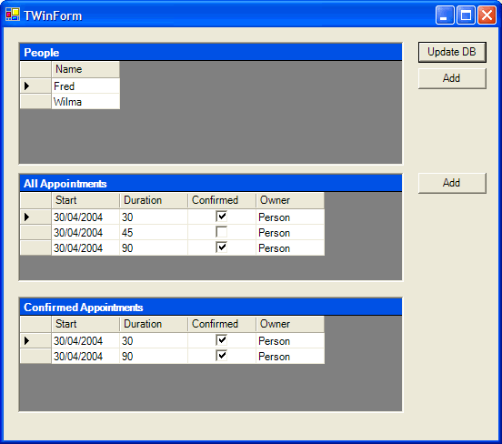 The screen shot below shows the two associations at runtime. Person.Appointments shows all appointments for a specific person (the second grid from the top), while Person.ConfirmedAppointments (the bottom grid) shows only those appointments for a specific Person that have the Confirmed attribute set to True.