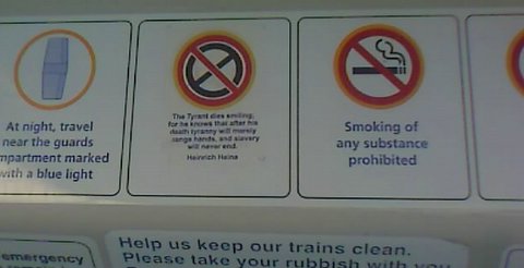 It’s a little hard to read, as I was using my camera phone and the train was moving around a bit, but it’s a quote from Heinrich Heine that says "The Tyrant dies smiling, for he knows that after his death tyranny will merely change hands, and slavery will never end."