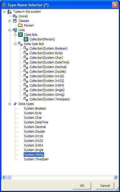 So, to specify the type of our Variable, we use the VariableHandle’s StaticValueTypeName property. Click on the Ellipsis button for this property and you should see the Type name Selector dialog shown below, which allows you to select the simple type or class, or collection of either, that you want this VariableHandle to hold. In our case, select System.String.