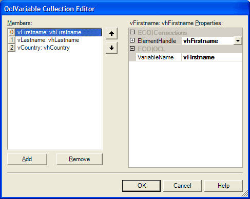 That’s great, but we still have no connection between the VariableHandles and the OCL in our ExpressionHandle. So, to hook them up, we need to drop down an OCLVariables component. This component is responsible for holding a collection of variables used in OCL, and the relevant VariableHandles from which their values should be retrieved. Select the OCLVariable component, and bring up the property editor for the OclVariablesCollection property. Add three members to the collection, and for each one, set the ElementHandle and VariableHandle properties. In the screenshot below, you can see how I’ve set the first one.