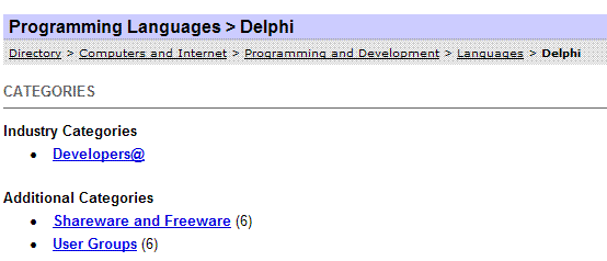 What had me stumped for awhile were the breadcrumbs. Breadcrumbs? Look in the Yahoo screenshot above. Near the top, it has a list of all the ancestor categories as links, so you can work your way back up to where you came from. I wanted to be able to get a list of the Category objects that make up the path from a specific Category all the way to the root. In the screenshot, it’s Directory, Computers and Internet, Programming and Development, Languages, Delphi from least specific down to most specific. Once I had this in a handle, I could bind it to an ASP.NET Repeater component and Robert’s your mother’s brother. I didn’t only need to access this path for the breadcrumbs, but that’s a nice, visible example of what I needed.