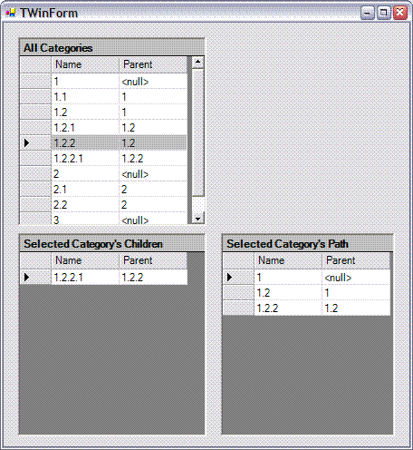 Works like a bought one, as you can see in the screenshot below. The top left grid is showing all the Category objects, and also serves to let us select a particular category. The bottom left grid is showing the children of the currently selected Category, and the bottom right grid is showing the contents of the currently selected Category’s Path association. Exactly what I needed.