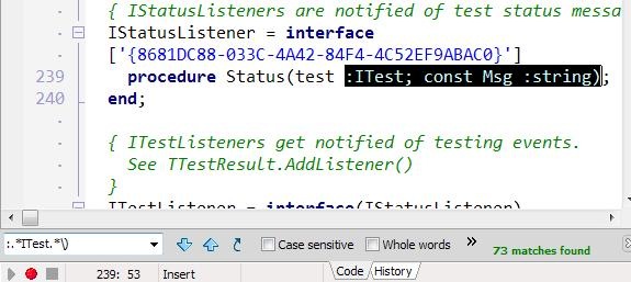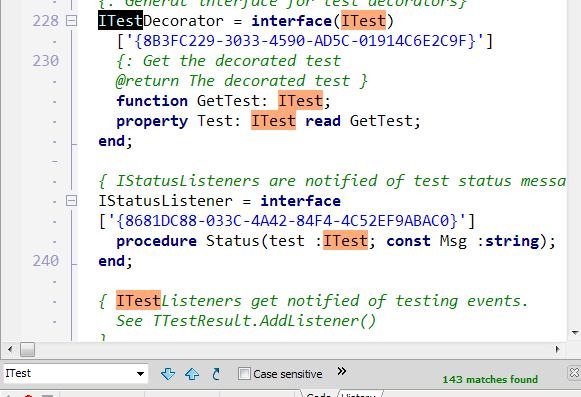 To use it, you need to enable Regular Expressions in your searches. In the screen shot above it’s not shown, but if you make your edit window wide enough (or click on the >> image next to Case Sensitive above) you’ll get the option to turn on Regular Expressions. (prior to Delphi 2010 it’s a checkbox on the modal dialog that pops up when you hit Ctrl-F). Then just type :.*ITest.*\) into the same search window you normally would.